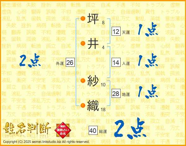 生活面を象徴する運勢です。外部から受ける影響力を表し、結婚運、家庭運や職場、環境への順応性を表します。総運から人運を引いた画数。姓や名が1文字の場合を除く。