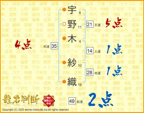 宇(6画)野(11画)木(4画) 紗(10画)織(18画)