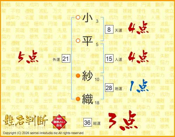 生活面を象徴する運勢です。外部から受ける影響力を表し、結婚運、家庭運や職場、環境への順応性を表します。総運から人運を引いた画数。姓や名が1文字の場合を除く。