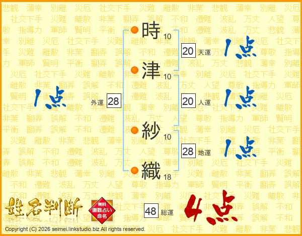 時(10画)津(10画) 紗(10画)織(18画)