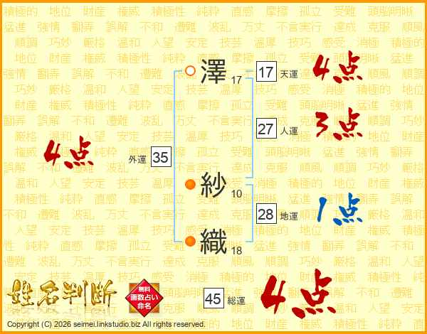 澤(17画) 紗(10画)織(18画)