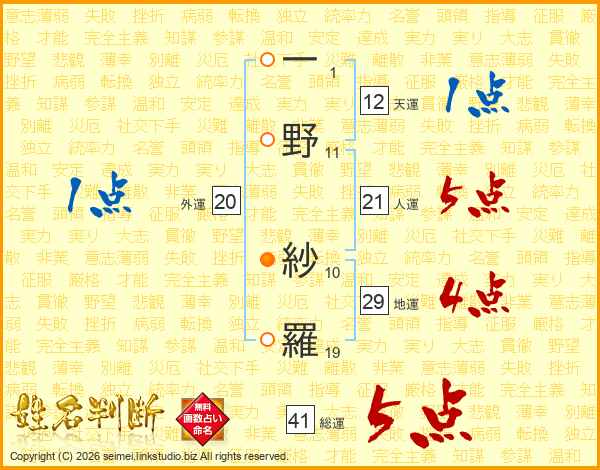 生活面を象徴する運勢です。外部から受ける影響力を表し、結婚運、家庭運や職場、環境への順応性を表します。総運から人運を引いた画数。姓や名が1文字の場合を除く。
