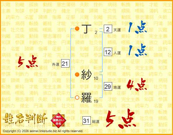 丁紗羅さんの総運は31画の5点!