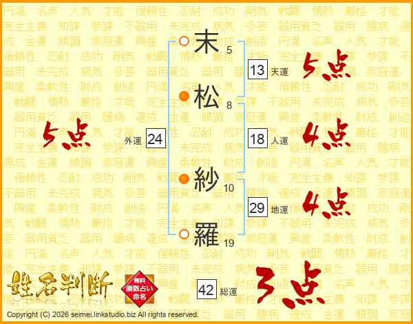 あなたの人生を表す1番重要な運勢です。生涯を通じて影響する総合運となり、主に50歳以降の晩年期に影響を及ぼします。苗字と名前の合計画数。