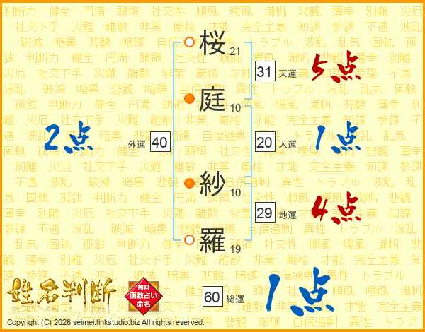 桜(21画)庭(10画) 紗(10画)羅(19画)