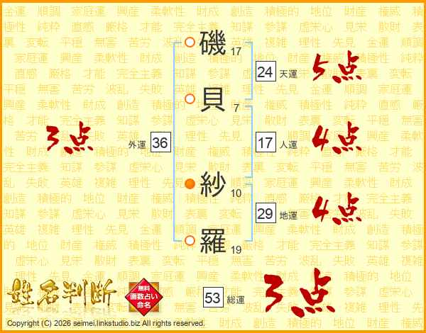 磯(17画)貝(7画) 紗(10画)羅(19画)