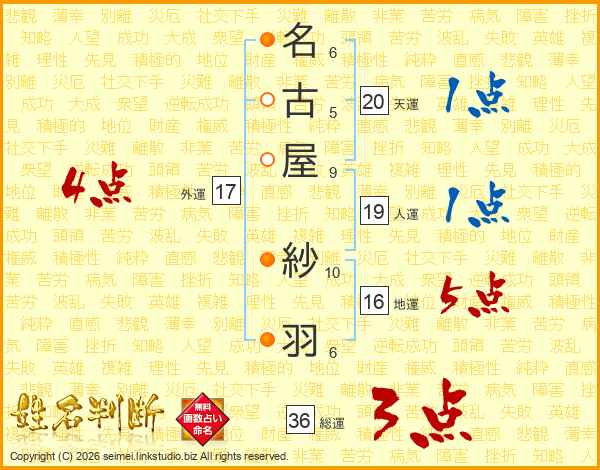 名(6画)古(5画)屋(9画) 紗(10画)羽(6画)