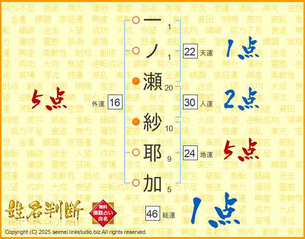 一ノ瀬紗耶加さんの総運は46画の1点!