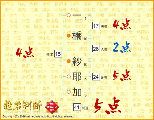 一(1画)橋(16画) 紗(10画)耶(9画)加(5画)