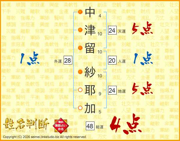 中(4画)津(10画)留(10画) 紗(10画)耶(9画)加(5画)
