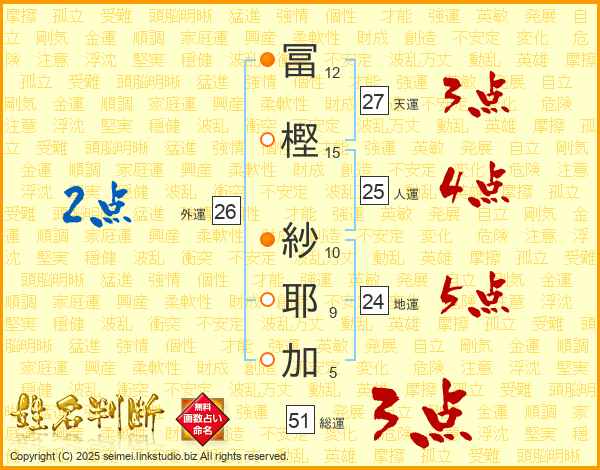 冨(12画)樫(15画) 紗(10画)耶(9画)加(5画)