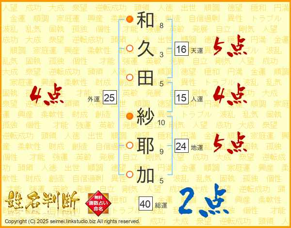 和(8画)久(3画)田(5画) 紗(10画)耶(9画)加(5画)