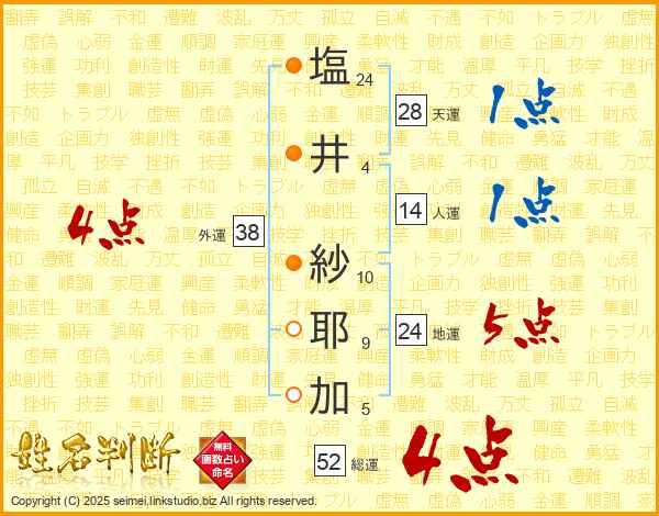 塩(24画)井(4画) 紗(10画)耶(9画)加(5画)