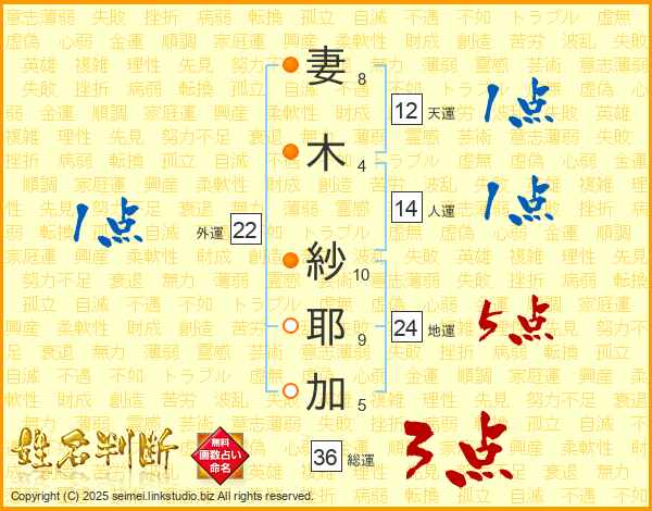 妻(8画)木(4画) 紗(10画)耶(9画)加(5画)