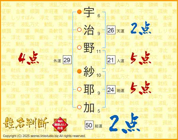 宇(6画)治(9画)野(11画) 紗(10画)耶(9画)加(5画)