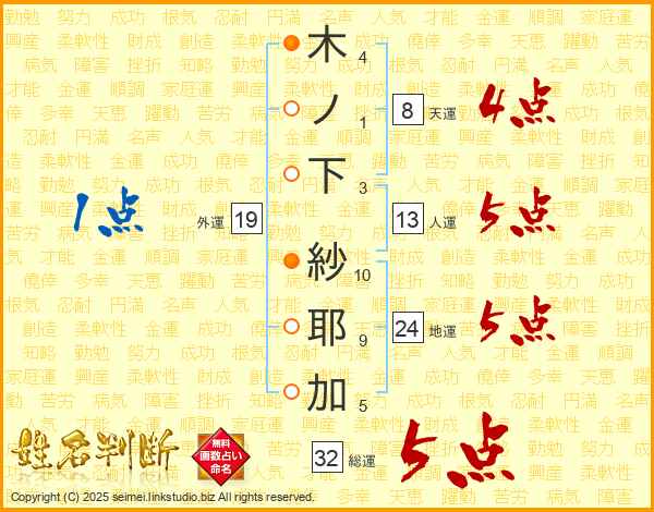 木(4画)ノ(1画)下(3画) 紗(10画)耶(9画)加(5画)
