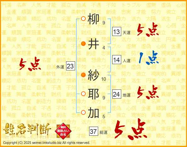 柳(9画)井(4画) 紗(10画)耶(9画)加(5画)