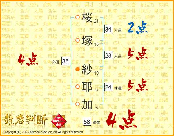 桜(21画)塚(13画) 紗(10画)耶(9画)加(5画)