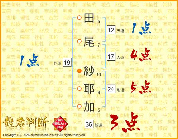 田(5画)尾(7画) 紗(10画)耶(9画)加(5画)