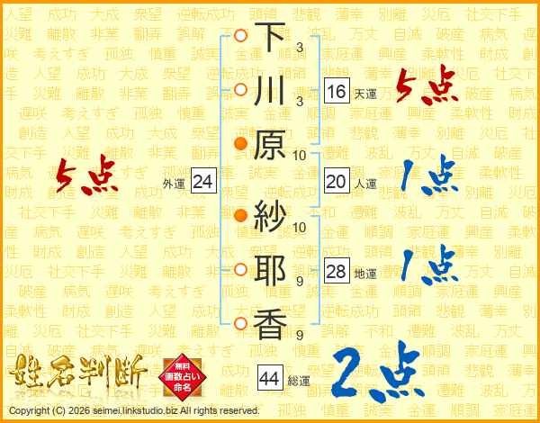 下(3画)川(3画)原(10画) 紗(10画)耶(9画)香(9画)