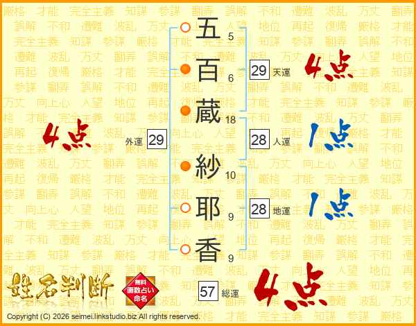 五百蔵紗耶香さんの外運は29画の4点!