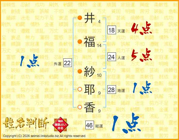 井(4画)福(14画) 紗(10画)耶(9画)香(9画)