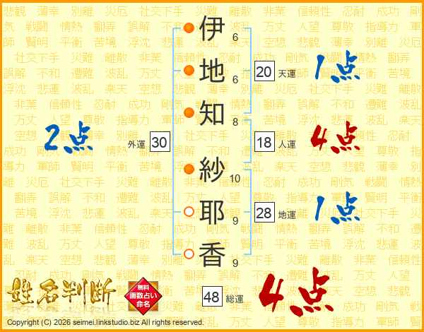 伊(6画)地(6画)知(8画) 紗(10画)耶(9画)香(9画)