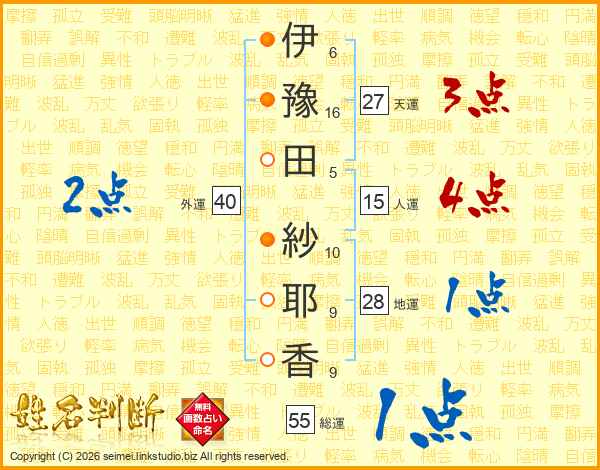 伊(6画)豫(16画)田(5画) 紗(10画)耶(9画)香(9画)