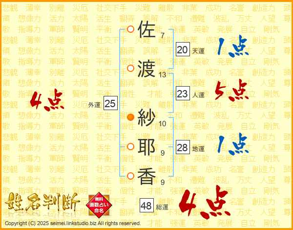 佐(7画)渡(13画) 紗(10画)耶(9画)香(9画)