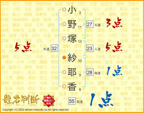小(3画)野(11画)塚(13画) 紗(10画)耶(9画)香(9画)