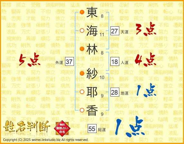 東(8画)海(11画)林(8画) 紗(10画)耶(9画)香(9画)