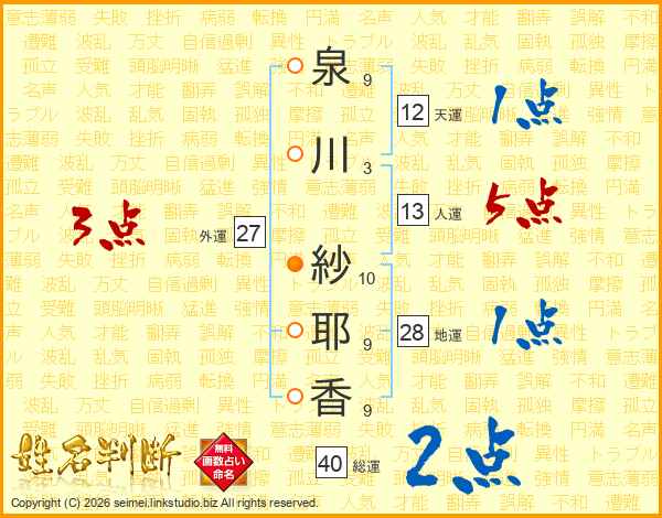 泉(9画)川(3画) 紗(10画)耶(9画)香(9画)