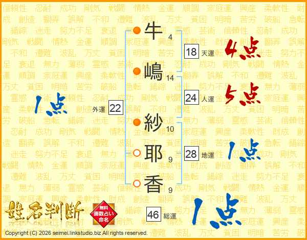 牛(4画)嶋(14画) 紗(10画)耶(9画)香(9画)