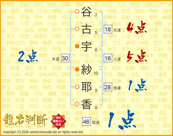 谷古宇紗耶香さんの総運は46画の1点!