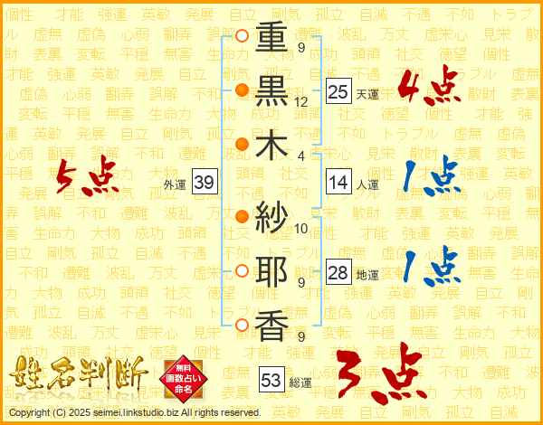重(9画)黒(12画)木(4画) 紗(10画)耶(9画)香(9画)