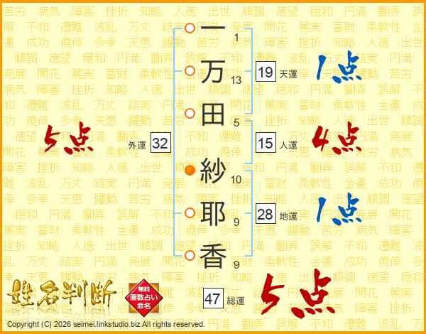 一(1画)万(13画)田(5画) 紗(10画)耶(9画)香(9画)