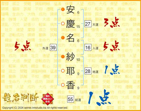 安(6画)慶(15画)名(6画) 紗(10画)耶(9画)香(9画)