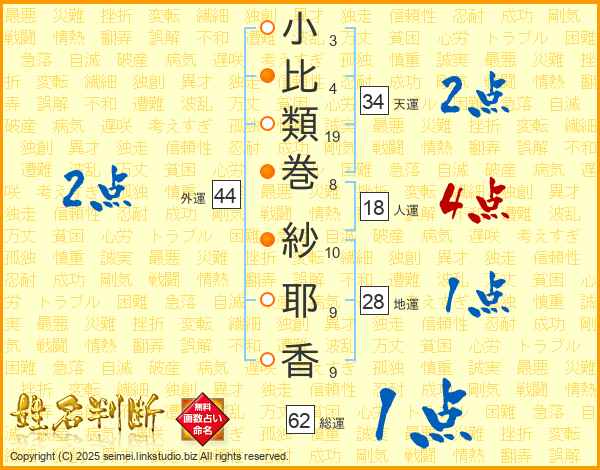 小(3画)比(4画)類(19画)巻(8画) 紗(10画)耶(9画)香(9画)