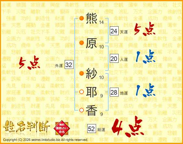 熊(14画)原(10画) 紗(10画)耶(9画)香(9画)