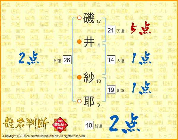磯(17画)井(4画) 紗(10画)耶(9画)
