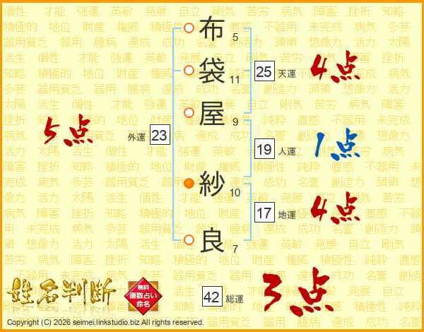 布(5画)袋(11画)屋(9画) 紗(10画)良(7画)