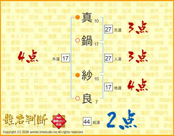 真(10画)鍋(17画) 紗(10画)良(7画)