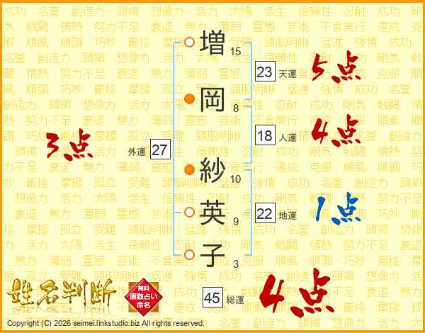 増(15画)岡(8画) 紗(10画)英(9画)子(3画)