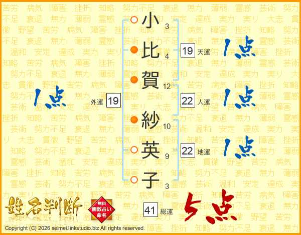 小比賀紗英子さんの総運は41画の5点!