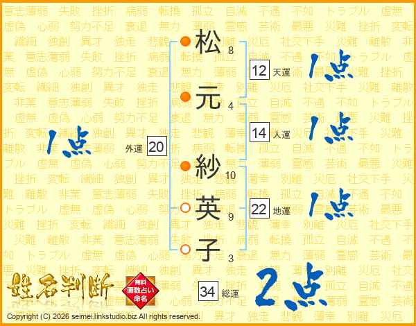 松(8画)元(4画) 紗(10画)英(9画)子(3画)