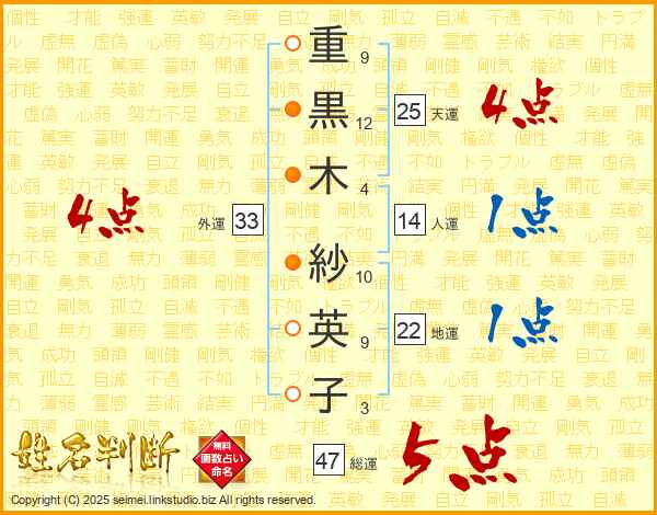 重(9画)黒(12画)木(4画) 紗(10画)英(9画)子(3画)