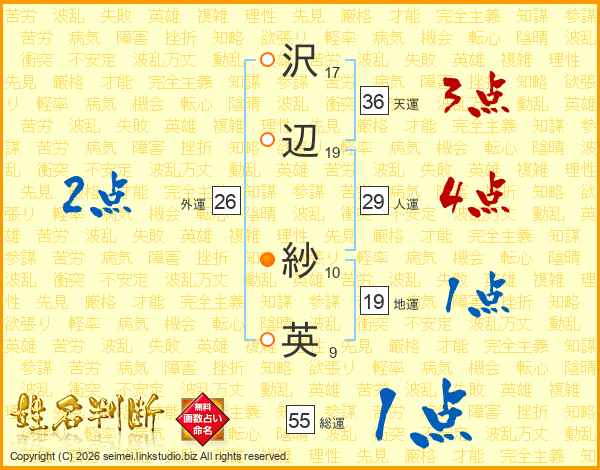 沢(17画)辺(19画) 紗(10画)英(9画)