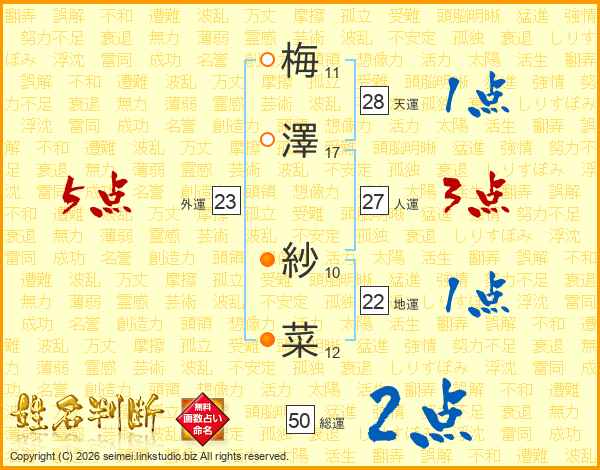 梅(11画)澤(17画) 紗(10画)菜(12画)