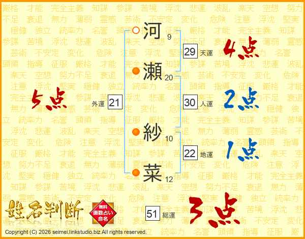 河瀬紗菜さんの総運は51画の3点!