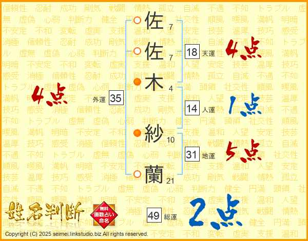 佐(7画)佐(7画)木(4画) 紗(10画)蘭(21画)